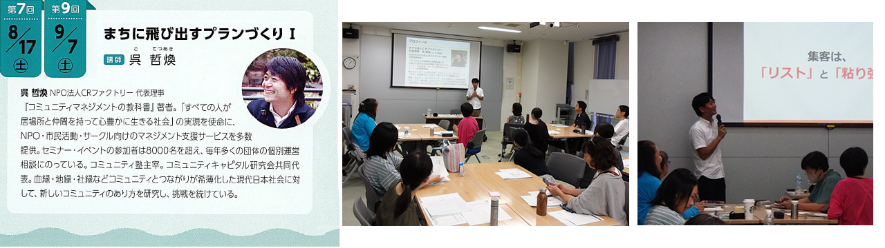 NPO・市⺠活動・サークル運営者向けのサービスを多数提供するNPO法人CRファクトリーの呉 哲煥さんに、イベント運営に強くなる・楽しくなるイベントの企画・運営についてや、イベント集客や広報・PRでの課題を実例をまじえながらお話いただき、イベント企画設計の実際の⼿順を学びました。